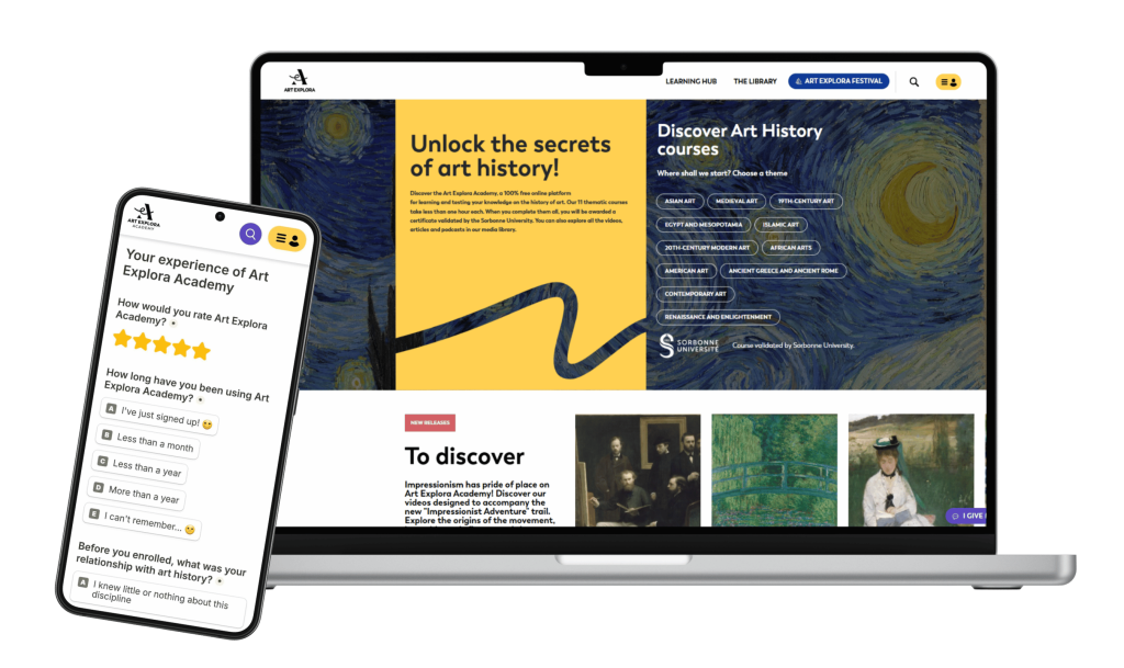 for learning and testing your knowledge on the history of art. Our 11 thematic courses take less than one hour each. When you complete them all, you will be awarded a certificate validated by the Sorbonne University. You can also explore all the videos, articles and podcasts in our media library.